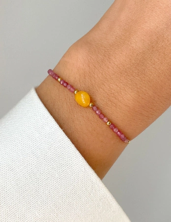 Armband aus Rosa Turmalin, Milch-Bernstein und Hämatit in Goldfarbe